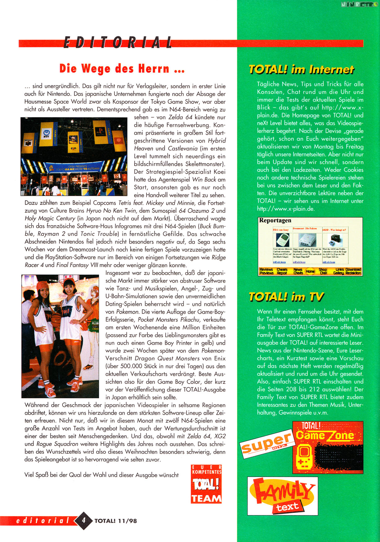 | *Hinweis: | Es werden nur Beiträge zu Konsolenthemen gelistet die für N.i.n.Retro eine Relevanz haben. Reviews sowie Berichte zu Computerspiele, oder Konsolensysteme die nicht auf dieser Internetseite gelistet sind, werden nicht berücksichtigt sofern diese in der jeweiligen Ausgabe vorhanden sind. (Betrifft zum größten Teil nur Zeitschriften die sich neben Videospiele auch mit Computersystemen beschäftigt haben.) |