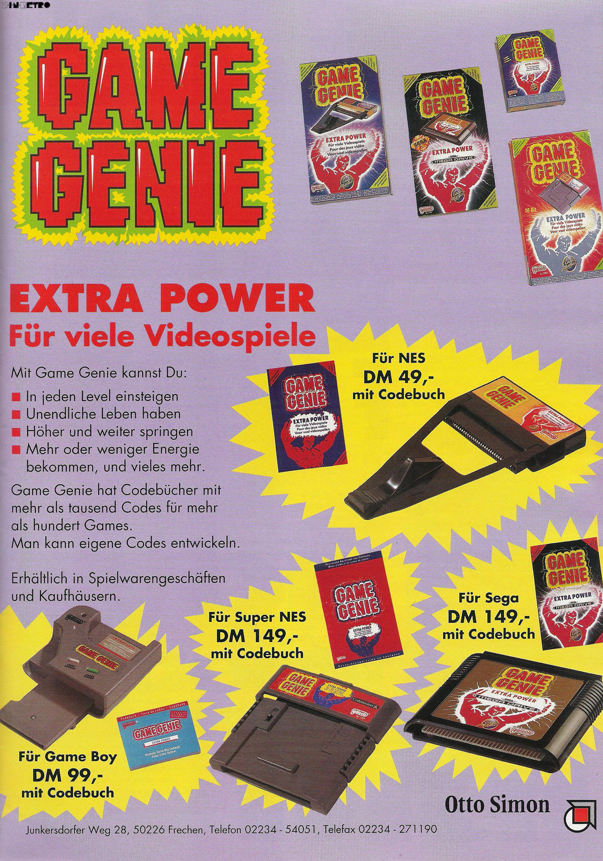 Ein Schulkamerad hat sich damals ein gebrauchtes NES gekauft, bei dem auch der Game Genie beilag... war wohl eine UK-Version, da es das Cheatmodul zu der Zeit in Deutschland noch nicht gab (zumindest erschien die Werbung dafür erst sehr viel später). War schon witzig damit herumzuexperimentieren, allerdings hatte ich immer Angst das NES könnte kaputt gehen oder das Modul, weil man das Ganze so schräg in den Schacht schieben musste. Vor zwei oder drei Jahren habe ich mir dann selbst einen Game Genie für das NES über eBay gekauft (inkl. Verpackung und Codebuch). K.a. ob ich den Dreh jetzt besser raus habe oder ob es an dem Cheatmodul liegt, aber nun klappt das mit dem ins-Modulschacht-schieben deutlich besser als früher. Muss gestehen, dass der Game Genie schon ganz praktisch ist, vor allem weil ich heute auch nicht mehr so wie früher die Nerven und die Zeit habe, eine Stelle x-mal zu wiederholen. Kann also jedem der ein derartiges Gerät für das NES sucht, mal den Game Genie auszuprobieren. Wie's mit den Versionen für die anderen Konsolen aussieht, weiß ich allerdings nicht.