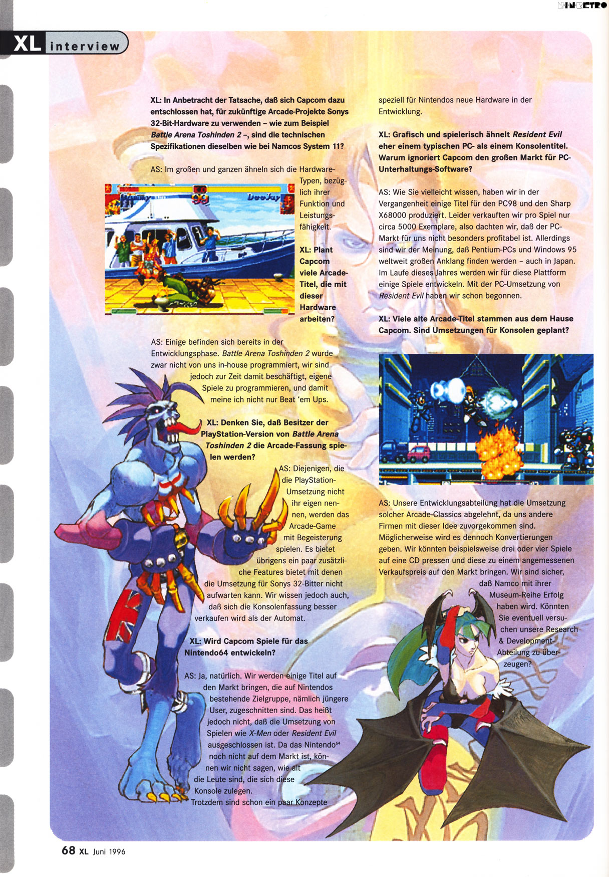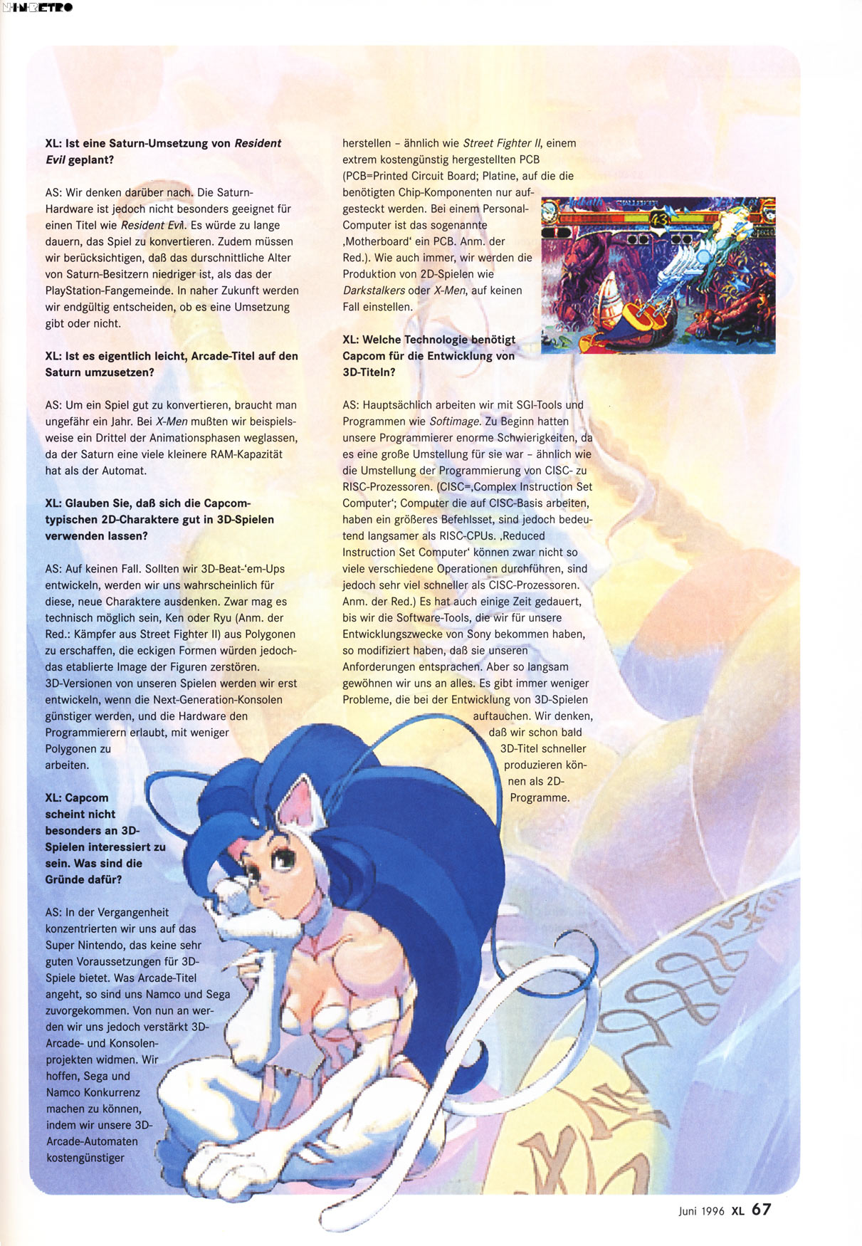 Etwas merkwürdig finde ich die Aussage zu 2D-Figuren in 3D-Spielen, also dass das das Image der Figuren zerstören würde, wenn man sie in die dritte Dimension holt, vor allem wegen der Tatsache, dass nicht mal ein Jahr später "Street Fighter EX Plus" in den Spielhallen stand und kurze Zeit später auch als "Street Fighter EX Plus Alpha" für die PlayStation erschien. Das Spiel müsste sich zum Zeitpunkt des Interviews bereits in der Entwicklung befunden haben und er benennt Ryu und Ken sogar noch als Beispiele. Na ja, spätter gab's dann ja auch noch Mega Man Legends usw.