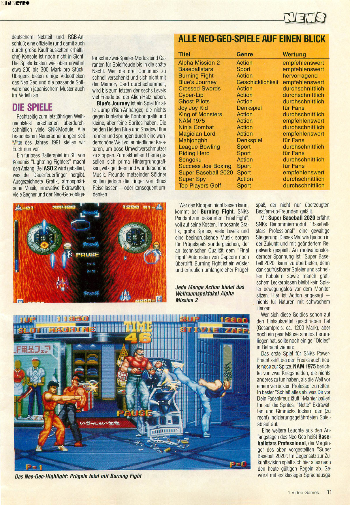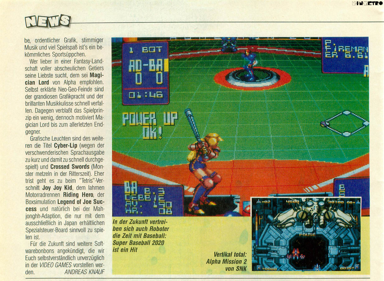 Hach, das Neo Geo ist einfach eine ganz besondere Konsole. 3D Wahn hin oder her, Mega Drive, SNES hin oder her, CD-Rom und Multimediatrend...das Neo Geo brachte haufenweise tolle Spiele hervor und trotz einiger "Ist ja nur für Fans von Prügelspielen"-Unkenrufe, gab es doch tolle Spiele aus praktisch allen Genres. Super Sidekicks 2%3 rocken bis heute, Windjammers ist einfach ein Partyspaß, Neo Turf Masters wohl das beste Arcadegolf aller Zeiten. Over Top, Blazing Star, Street Hoop, Pulstar, Metal Slug, Shock Troopers, Puzzle de Pon, Strikers 1945, Sengoku, League Bowling (warum fand die VG das so schlecht?)